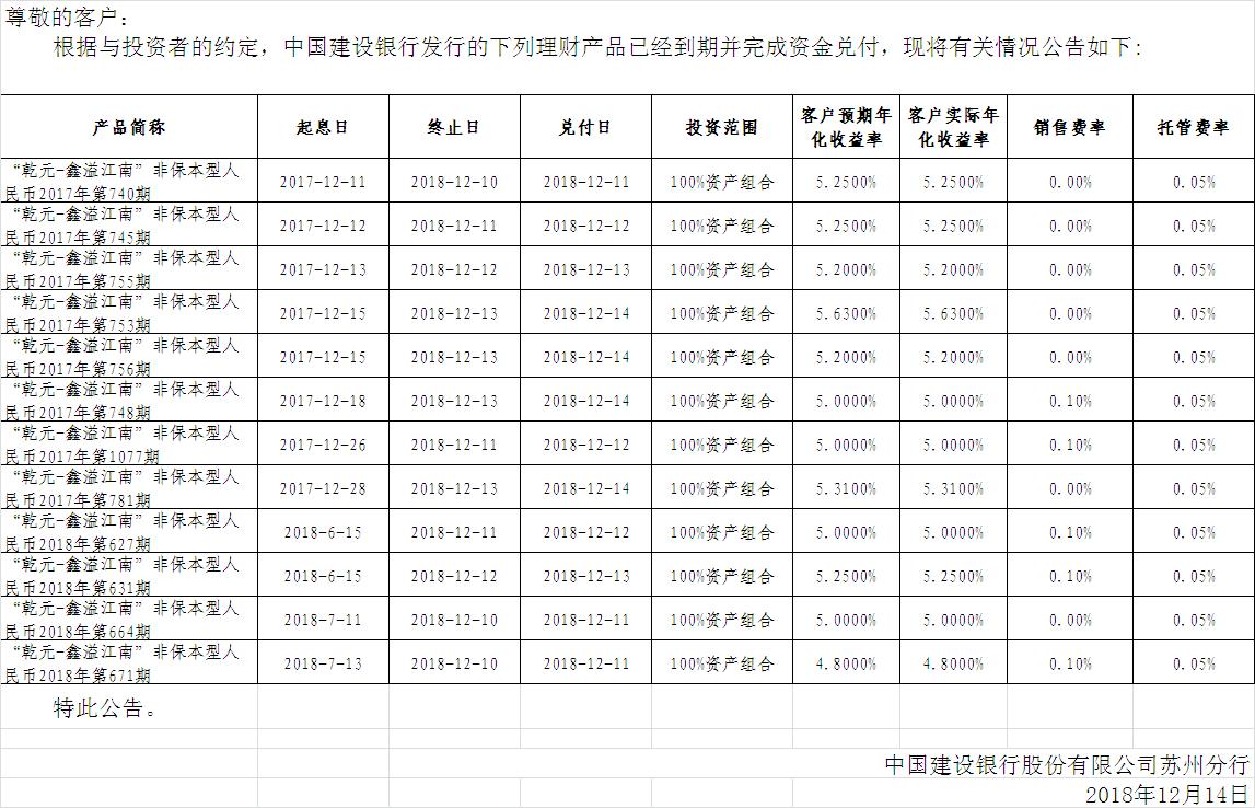 中国建设银行理财产品终止及清算公告1214