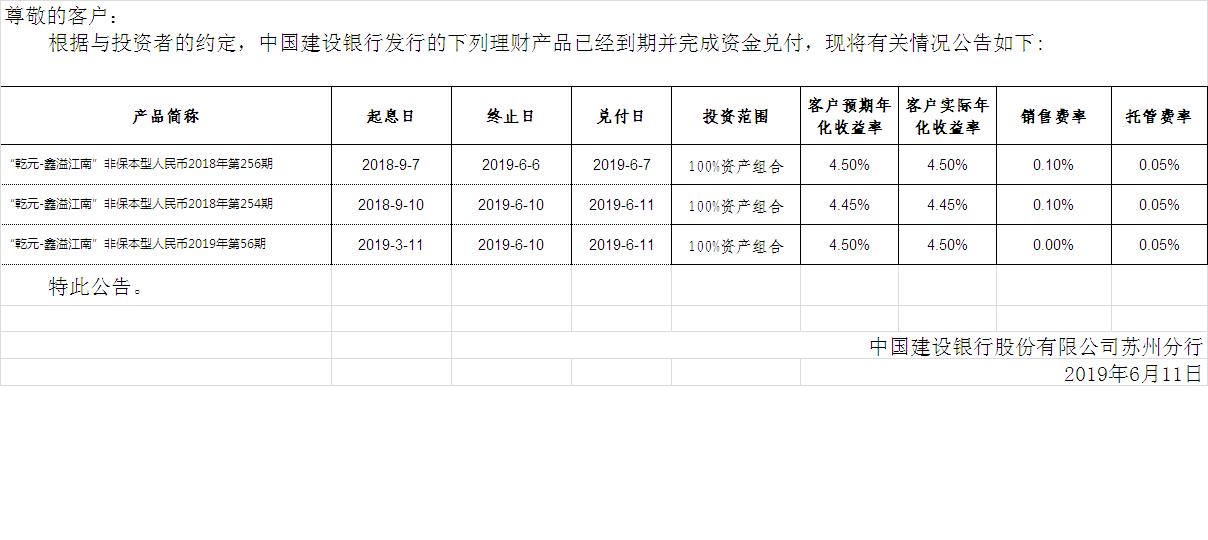 中国建设银行理财产品终止及清算公告